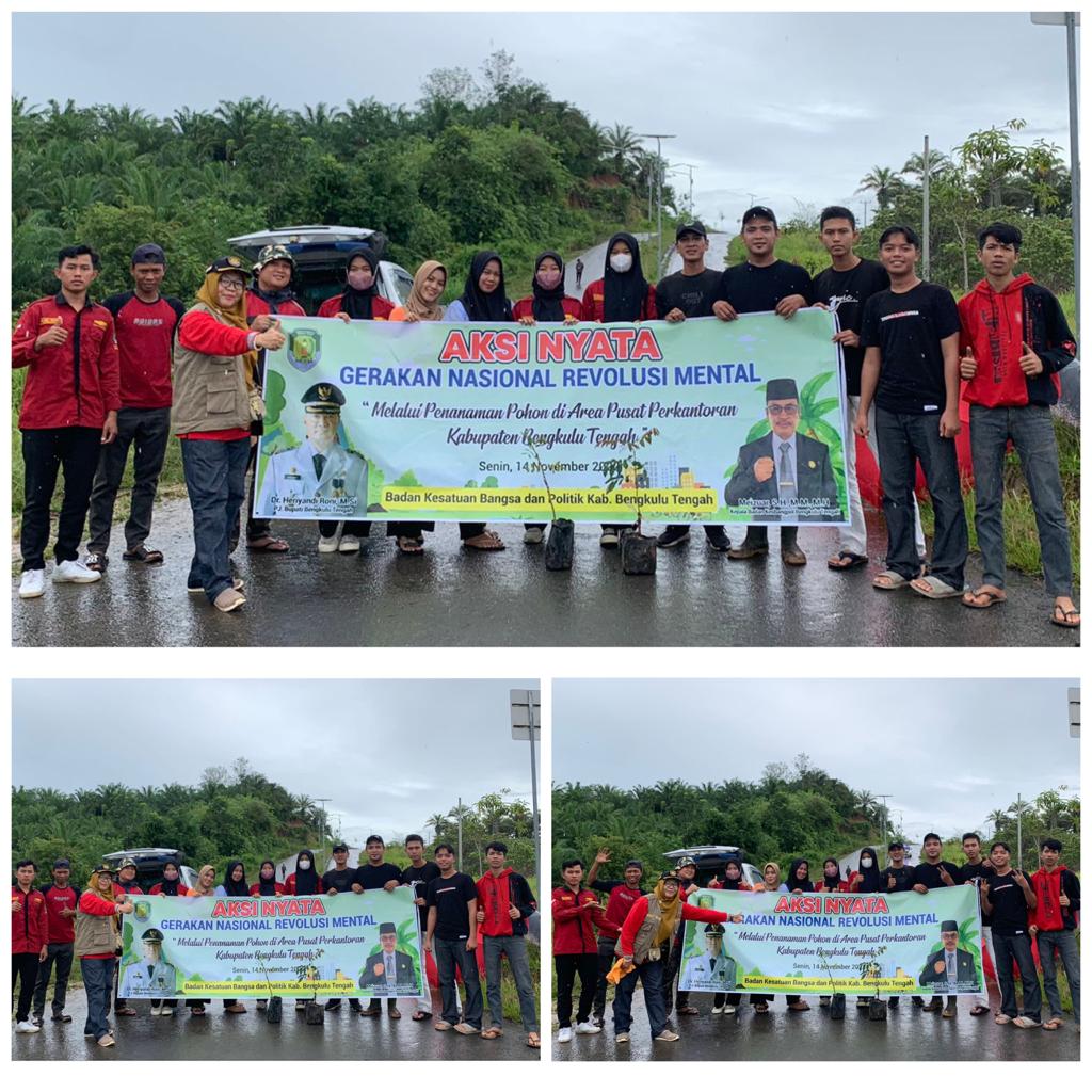 Senin 14 November 2022 diselenggarakan kegiatan Aksi Nyata GERAKAN NASIONAL REVOLUSI MENTAL melalui Penanaman Pohon bertempat di Kantor Bakesbangpol Bengkulu Tengah dan Pusat Perkantoran Renah Semanek Pukul 09.00 Wib s/d Selesai. Adapun Peserta dalam Kegiatan ini terdiri dari ASN Bakesbangpol, Ikatan Mahasiswa Bengkulu Tengah, serta Karung Taruna dan Pemuda/i Karang tinggi. Kegiatan di buka langsung oleh Kepala Badan Kesbangpol; Meizuar, S.H.,M.M.,M.H didampingi oleh Kepala Dinas Lingkungan Hidup Bengkulu Tengah ; Mahendra Gustian, S.Hut.