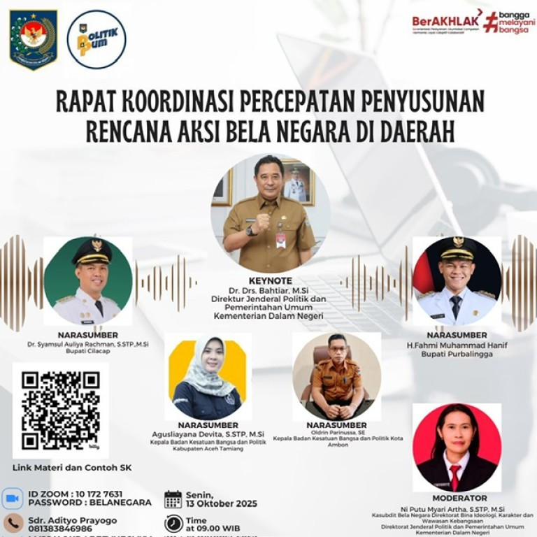 Kesbangpol_benteng, Dalam rangka penataan aksi bela negara, Ditjen Politik dan Pemerintahan Umum (Kemendagri) menyelenggarakan Rapat Koordinasi Percepatan Penyusunan Rencana Aksi Bela Negara di Daerah, pada Senin 13 Oktober 2025 pukul 08.30 S/d 13.00 WIB melalui Aplikasi Zoom Meeting.