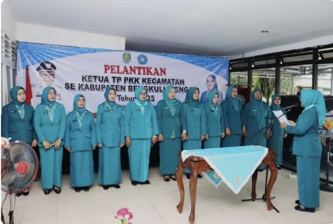 Kesbangpol_benteng, Tim Penggerak Pemberdayaan dan Kesejahteraan Keluarga (TP PKK) Kabupaten Bengkulu Tengah, Dr. Susilo Damarini, M.Ph., secara resmi melantik 11 ketua TP PKK tingkat kecamatan di Aula Kantor Camat Karang Tinggi, pada Rabu (16/10/2025).